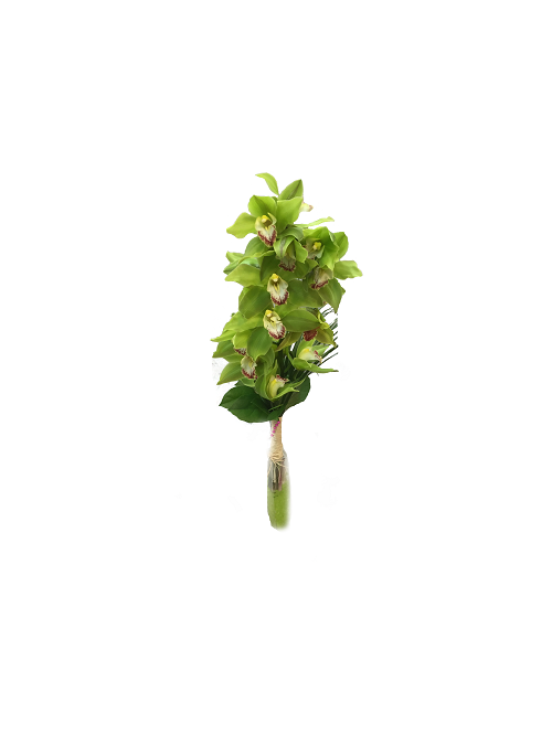 Kestävä cymbidium orkidea kimppu, sisältää myös koristevihreää ja maljakon.
