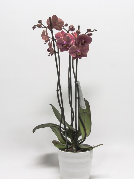 Kolme vanainen perhosorkidea. Korkeus noin 65 cm, ruukun halkaisija 11 cm. Valkoinen ruukku ei kuulu hintaan.