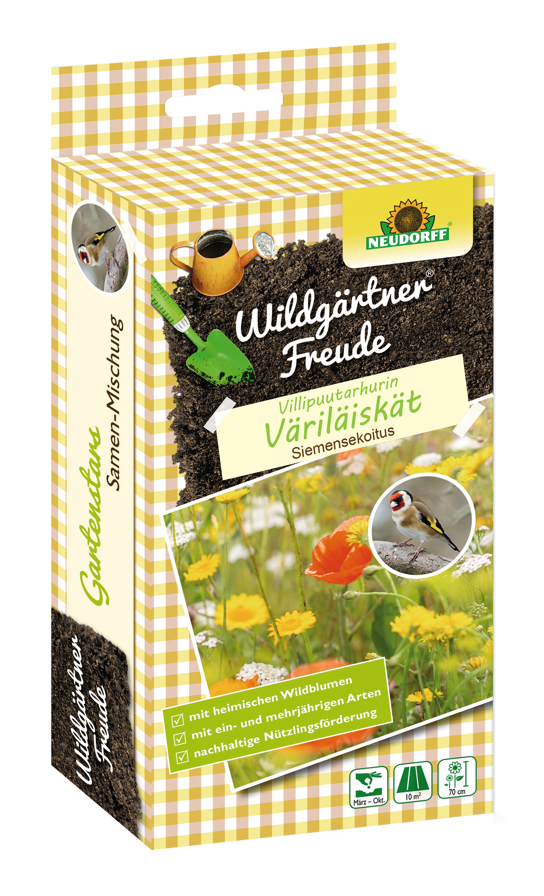 Runsaasti kukkiva siemensekoitus jossa enimmäkseen luonnonkukkia ja -kasveja. Ihastuttavat kukat vetävät puoleensa kotimaisia laululintuja. Siemen- ja hyönteissyöjälintujen haluttu ravinnonlähde. Sisältää suurisiemenisiä kasveja joilla on kestävät siemenvarret, esim. häränkukkaa, auringonhattua ja nukulaa. Helppo annostella kylvöapuaineen avulla. 1 pakkaus riittää 10 m²:ille Käyttö: Kylvöajankohta: maalis-kesäkuu ja syys-lokakuu Kukinnan alku: huhti-syyskuu Kasvukorkeus noin 70 cm Sirottele kylvösiemen tasaisesti juuririkkaruohoista vapautetulle maalle ja painele kevyesti, kastele hyvin ja pidä tasaisen kosteana. Sopii kaikille maatyypeille. Sisältö: 50 g pahvilaatikko jossa siemensekoitus 10 m²:lle