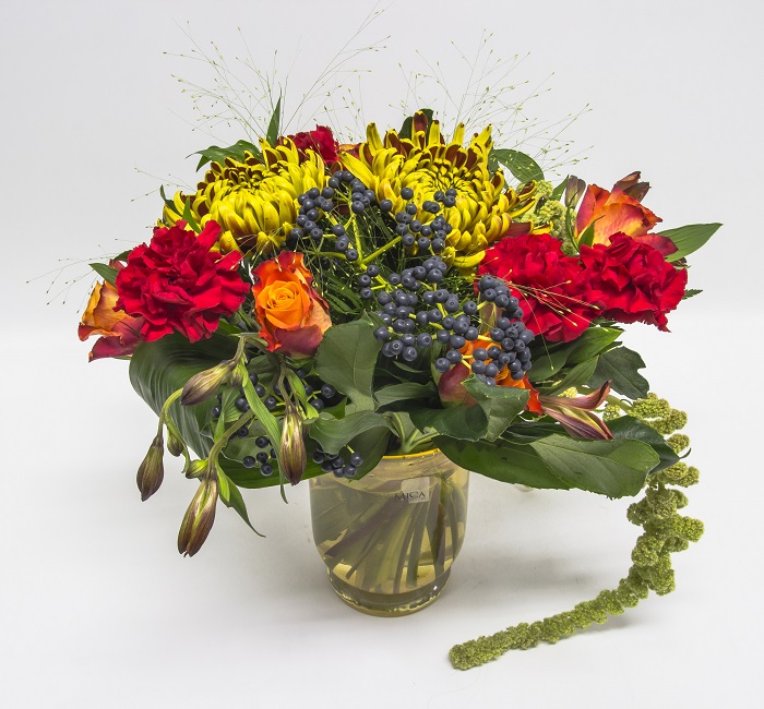 Kimppu sisältää mm. neilikkaa, krysanteemia, ruusu ja inkaliljoja, sekä koristevihreitä.