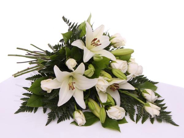 Ruusupohjainen hautakimppu. Lisäkukkina käytetään kauden kukkia ja koristevihreä
