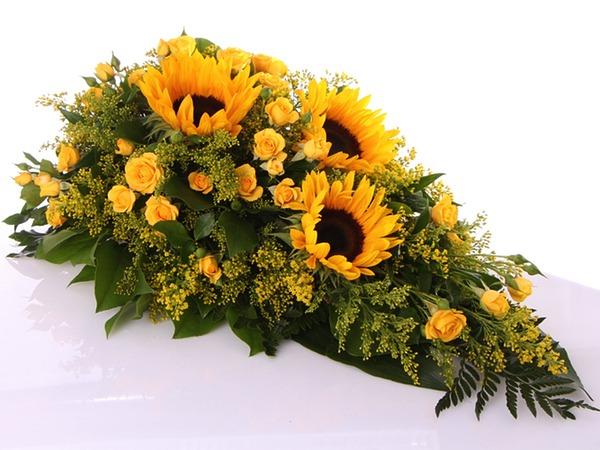 Kaunis surulaite ruusuista, auringonkukista, kultapiiskusta sekä koristevihreistä.