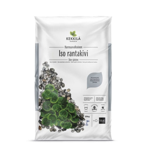 Iso rantakivi Harmaavalkoinen on kaunis, veden pyöreäksi hioma kivi tumman ja vaaleamman harmaan ja lähes valkoisen sävyissä, mukana myös hieman punertavia kiviä. Raekoko on 16- 32 mm. Yhdestä säkistä riittää n. 0,5 m2 alueelle. Luontaisesti pyöristynyt rantakivi tulee Ruotsista ja pakataan Suomessa.