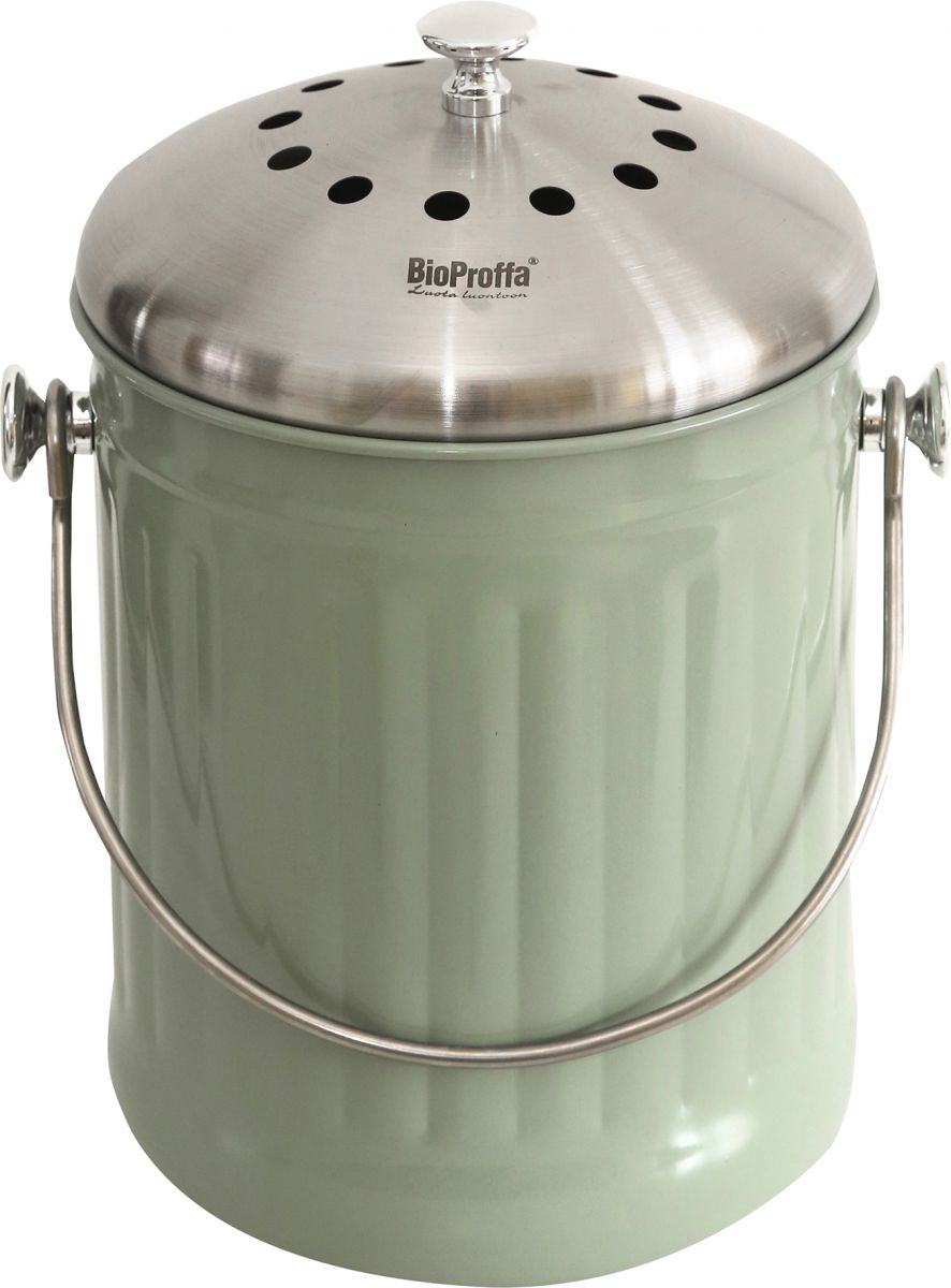 Biokeruuastia Bioproffa 5 l vihreä Kestävä 5 litran metallinen biokeruuastia, mihin voi laittaa kaikki ruokajätteet aterian jälkeen. Astiaan voi kerätä vihannesten ja hedelmien kuoret, ruokajätökset ym. Jätteiden voi antaa kertyä sinne useankin päivän ajan eikä tarvitse huolehtia kärpäsistä tai epämiellyttävästä hajusta kodissa. Kannessa oleva aktiivihiilisuodatin pitää hajut kurissa. Tekniset tiedot Halkaisija: 20 cm Korkeus: 29 cm Tilavuus: 5 l Materiaali: metalli Väri: basilikanvihreä Lisätiedot Puhdistus: Astia pestään lämpimällä saippuavedellä. Aktiivihiilisuodatinta voi pestä liuottamalla sitä saippuavedessä ja samalla ravistaa sitä hiukan, jotta kiintynyt lika irtoisi suodattimesta. Noin 20 minuutin liuotuksen jälkeen huuhtele astia lämpimällä vedellä. Suodatin kestää useita kuukausia. Astian sisällä voi käyttää myös muovipussia.