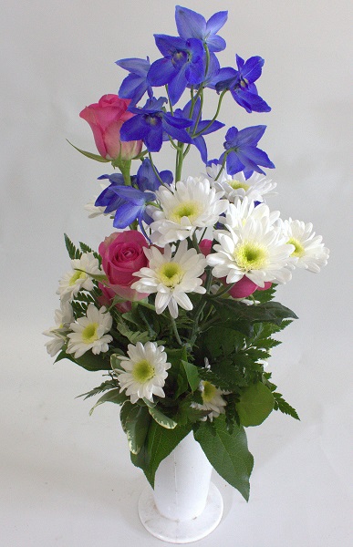 Sini-puna-valkoinen eritasokimppu sisältää ritarinkannusta, valkoista gerberaa, vaaleanpunaisia ruusuja, sekä koristevihreää.