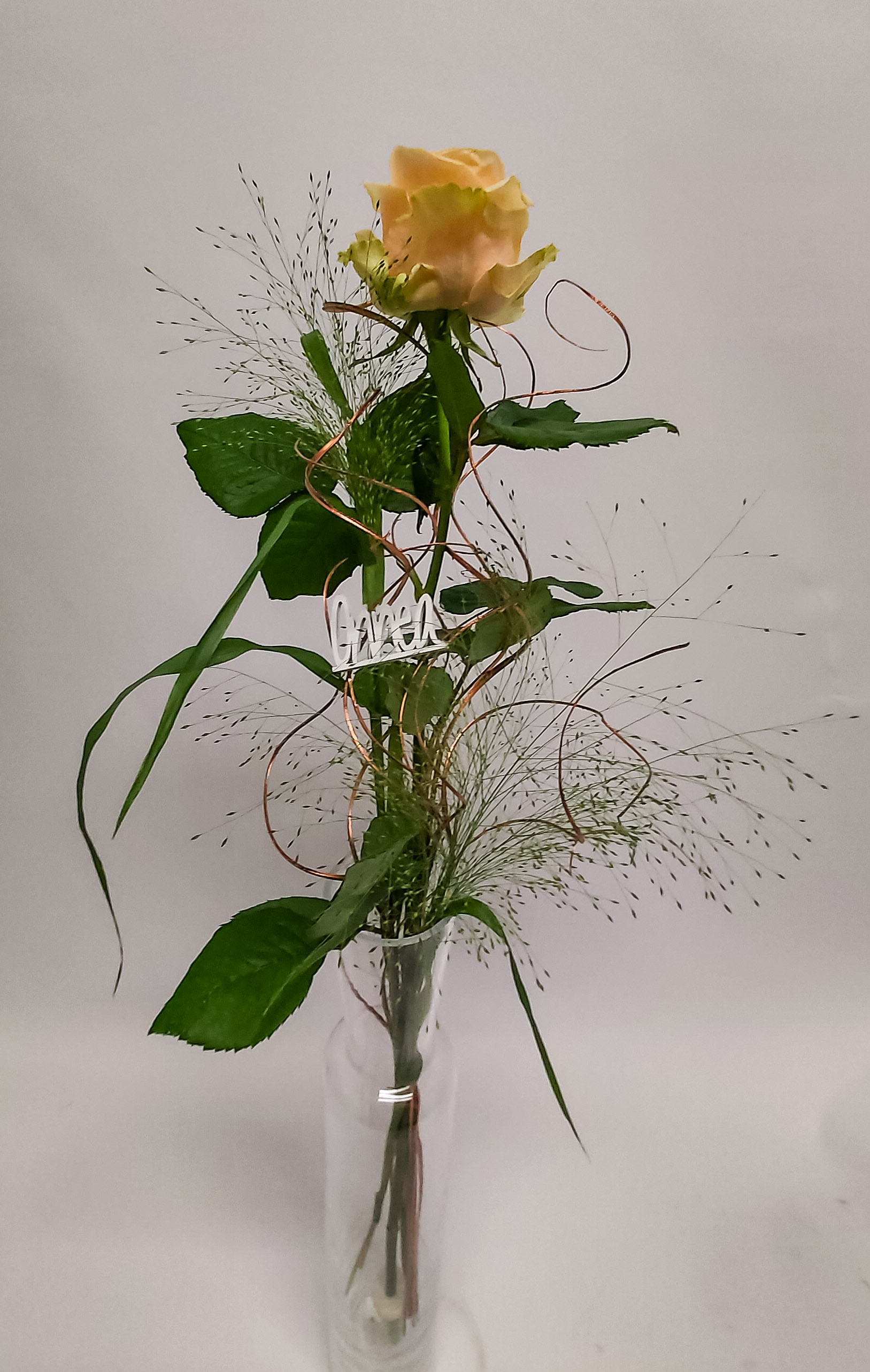 Yksittäinen ruusu koristeltu hirssillä ja onnea kyltillä.