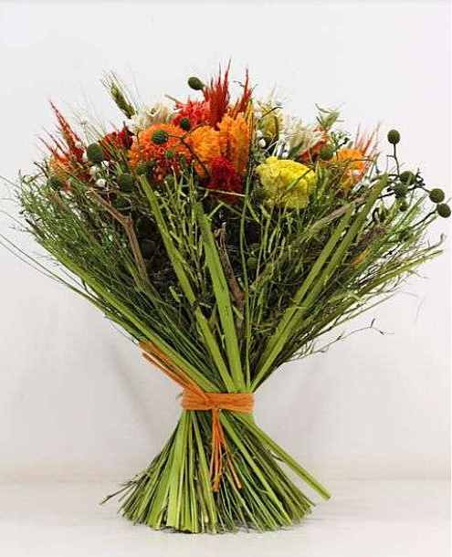 Kuvankaltainen trendikäs kuivakukkakimppu. Korkeus n. 27 cm, halkaisija 30 cm.