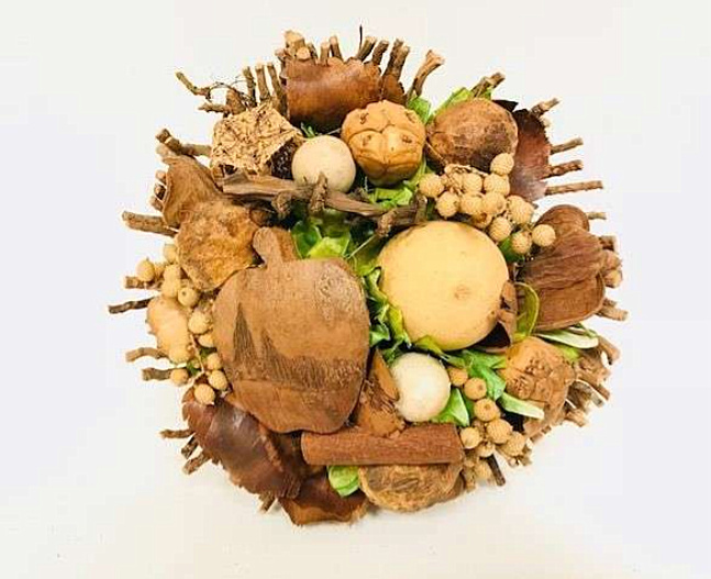 Luonnollinen kuivakukkakimppu kookoskuorella ja omenalla