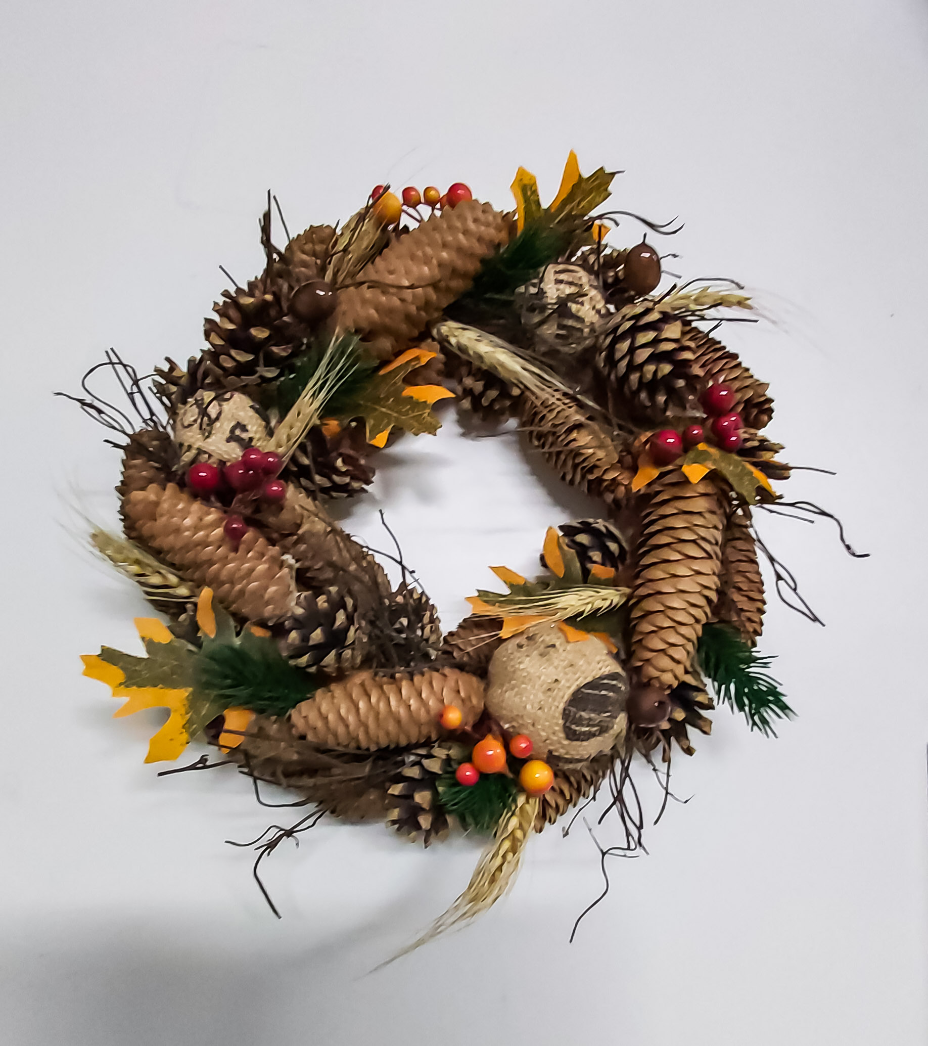 Syksyinen kranssi kävyillä ja marjoilla