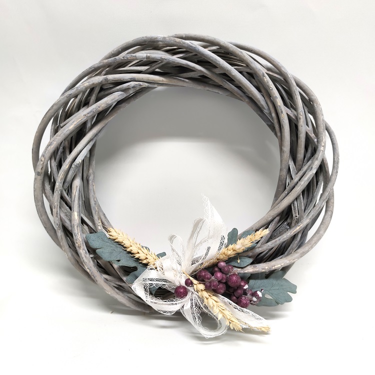 Puinen kransii, joka on koristeltu luonnon läheisillä tuotteilla. Halkaisija 29,5 cm ja paksuus 3 cm.