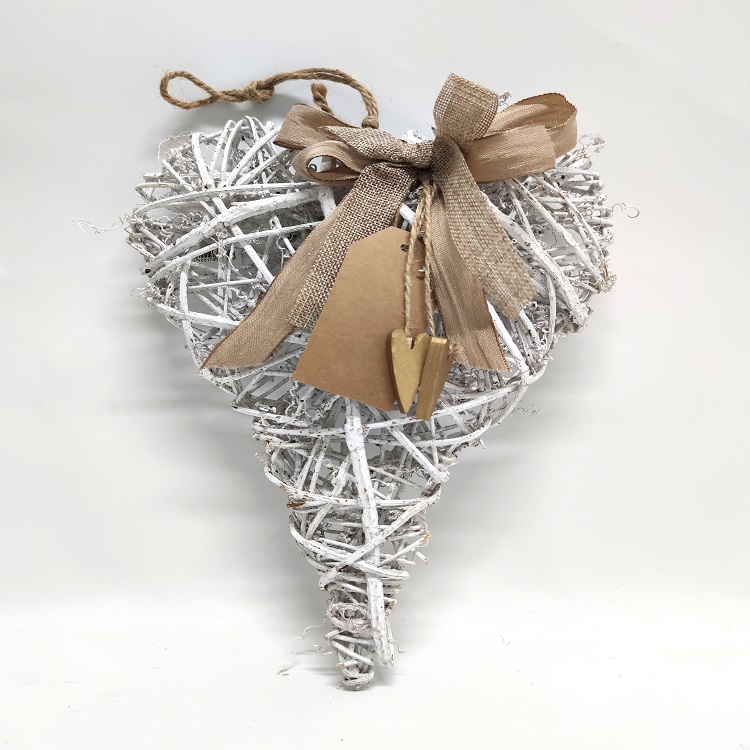 Puinen sydänkranssi ruskeilla koristeilla. Korkeus 22,5 cm, leveys 25 cm ja paksuus 6 cm.