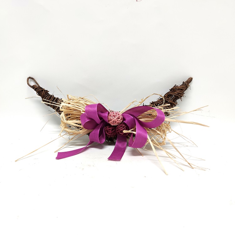 Puinen kranssi heinillä ja palloilla. Korkeus 11 cm, leveys 39 cm ja paksuus 5 cm.