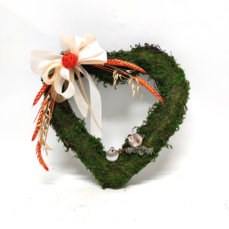 Sammal kranssi lintu koristeilla. Korkeus 30 cm, leveys 32,5 cm ja paksuus 6 cm.