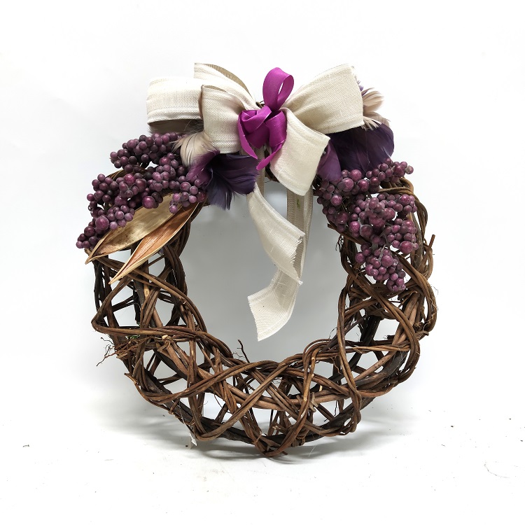Puinen kranssi höyhenillä ja marjoilla. Halkaisija 36 cm ja paksuus 9,5 cm.