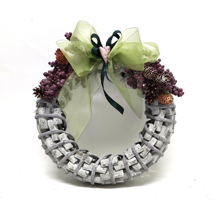 Puinen kranssi vihreillä ruseteilla. Halkaisija 38 cm ja paksuus 11 cm.