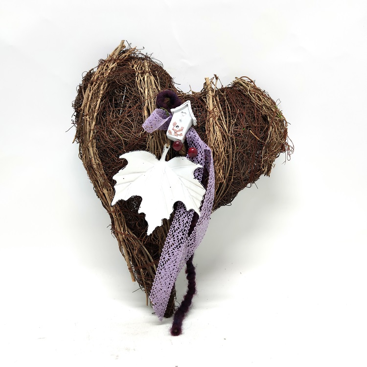 Puinen sydänkranssi lehti ja linnunpönttö koristeilla. Korkeus 32 cm, leveys 30 cm ja paksuus 9 cm.