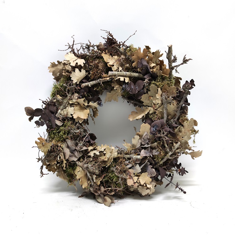 Sammal kranssi lehdillä ja oksilla. Halkaisija 36 cm ja paksuus 10 cm.