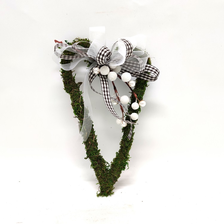 Sammal sydänkranssi talvisilla koristeilla. Korkeus 28 cm, leveys 16 cm ja paksuus 2,5 cm.