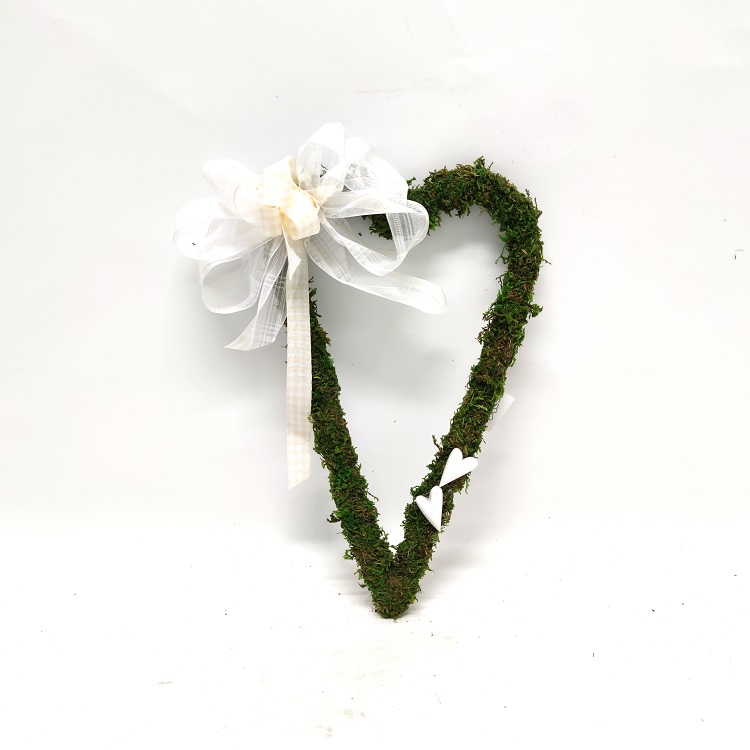 Sammal sydänkranssi valkoisilla koristeilla. Korkeus 29 cm, leveys 18 cm ja paksuus 2 cm.