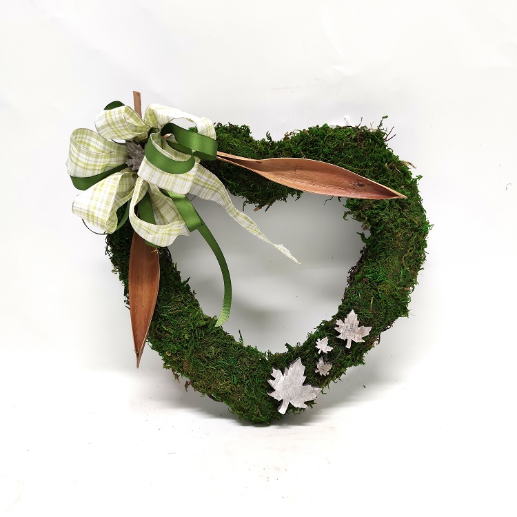 Sammal sydänkranssi puisilla lehti koristeilla. Korkeus 28 cm, leveys 33 cm ja paksuus 5 cm.