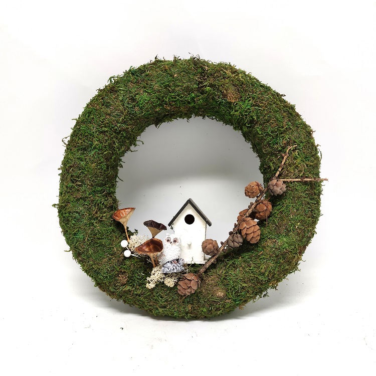 Sammal kranssi pöllö ja linnunpönttö koristeilla. Halkaisija 37,5 cm ja paksuus 7 cm.