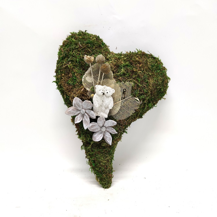 Sammal sydänkranssi nalleilla ja kukilla. Korkeus 33 cm, leveys 23 cm ja paksuus 7 cm.