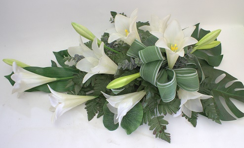 Hautalaite valkoisista liljoista, sekä sisältää muun muassa eukalyptysta, peikonlehtiä ja koristevihreät.