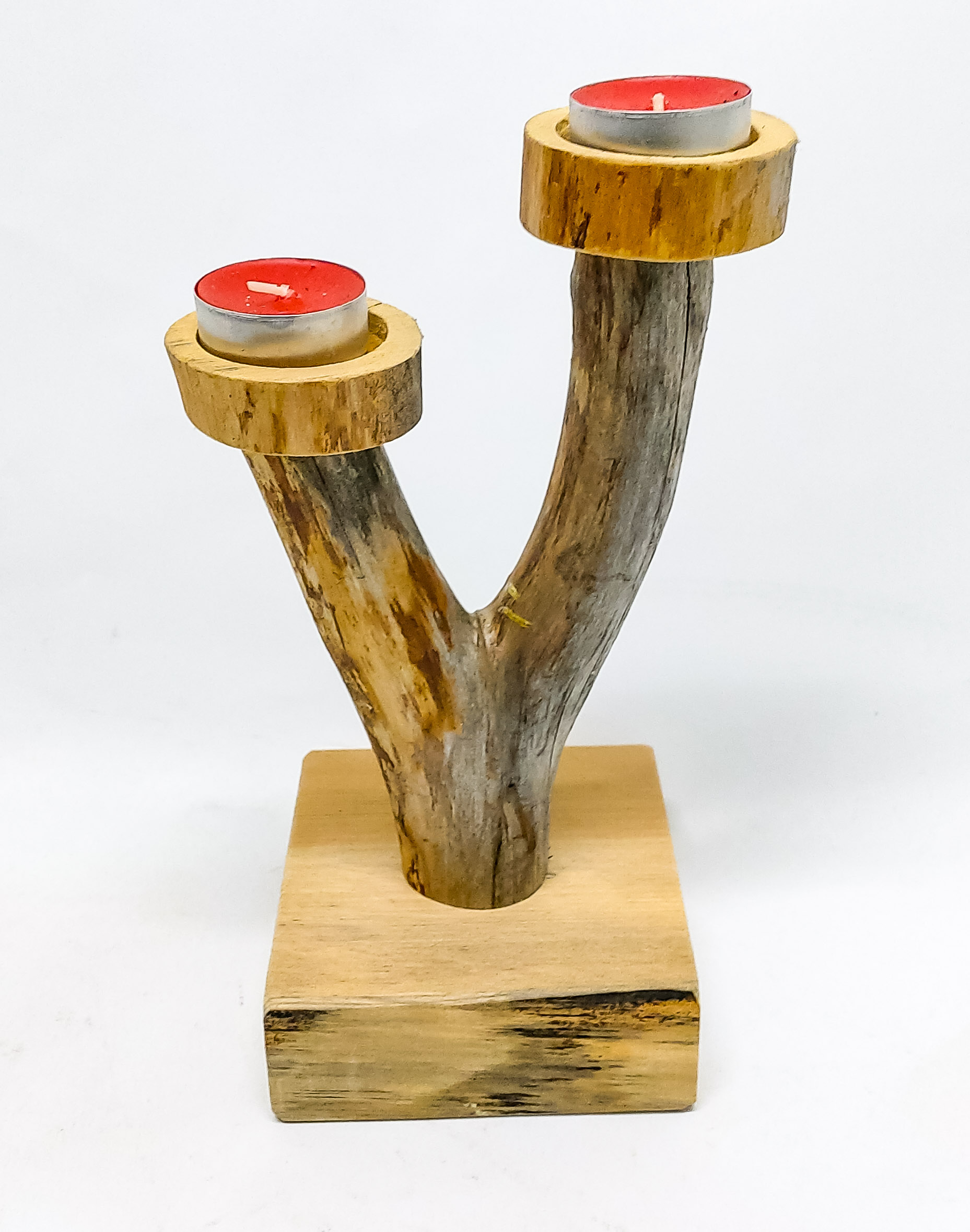 Puinen kynttilänjalka, aitoa paikallista käsityötä. Korkeus 25 cm, leveys 12 x 12 cm.