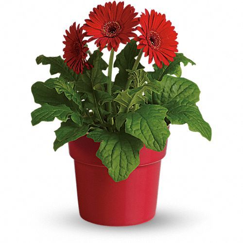 Ruukkugerbera väreissä keltainen, oranssi ja punainen. Korkeus noin 30 cm. Alusruukku ei kuulu hintaan.