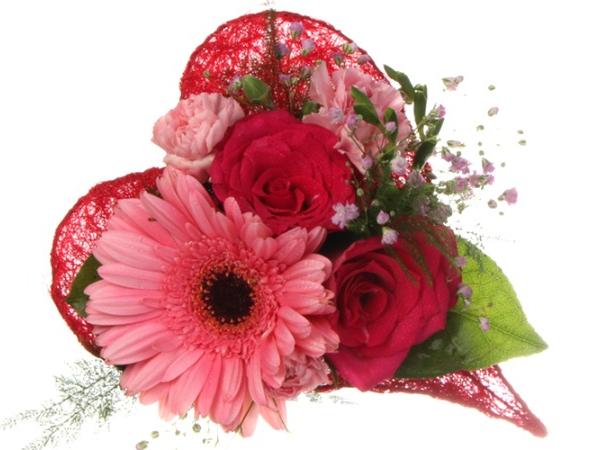 Kimppu sisältää gerberaa, neilikkaa, ruusua, harsokukkaa sekä koristevihreää.