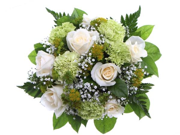 Vaaleat sävyt kauden kukista. Ruusupohjainen. Käytettävät kukat vaihtelevat kauden ja myymälän valikoiman mukaan.