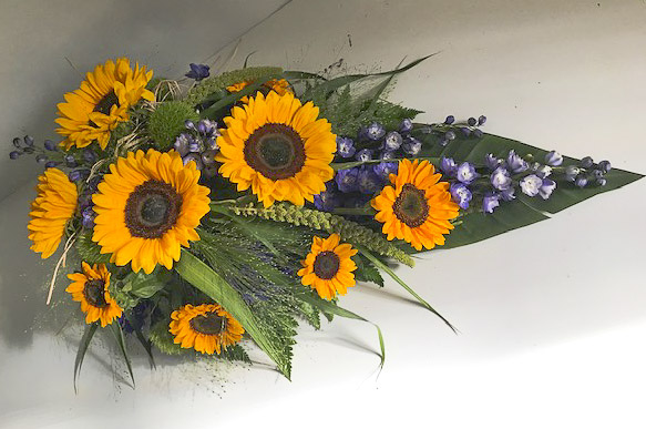 Kaunis surulaite auringonkukista, sekä koristevihreistä.
