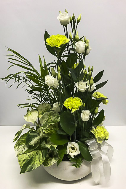 Eritaso istutus neilikoista, eustomasta ja koristevihreistä. Lisäksi asetelma sisältää kentiapalmua sekä kultaköynnöstä. Ruukku kuuluu tuotteen hintaan.