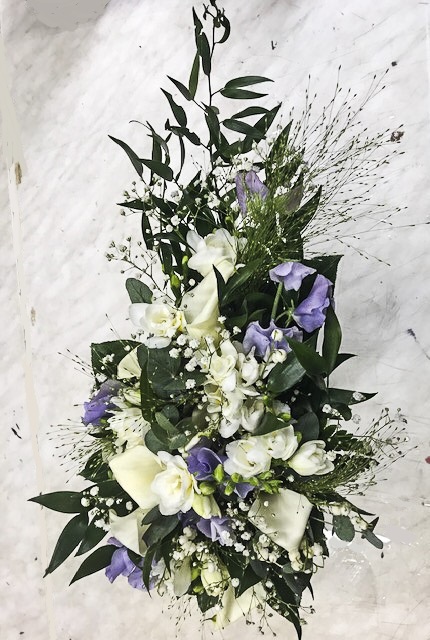 Kuvanmukainen näyttävä juhlakimppu calloista, freesiasta ja muista kauden kukkasista.
