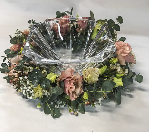 Kuvanmukainen näyttävä kukkakranssi kastepöytään kauden kukista.