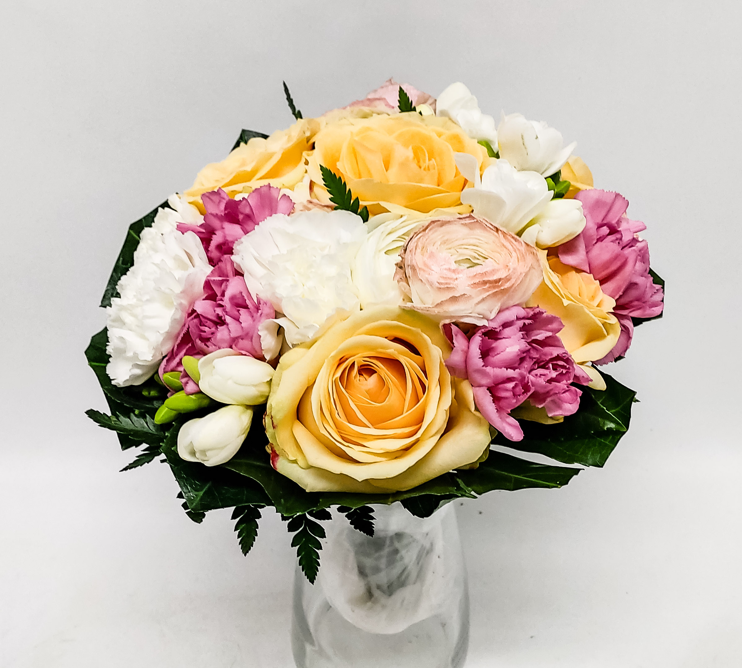 Kuvanmukainen matalaan sidottu kukkakimppu ruususta, neilikasta, leinikistä, sekä muista kauden kukkasista.