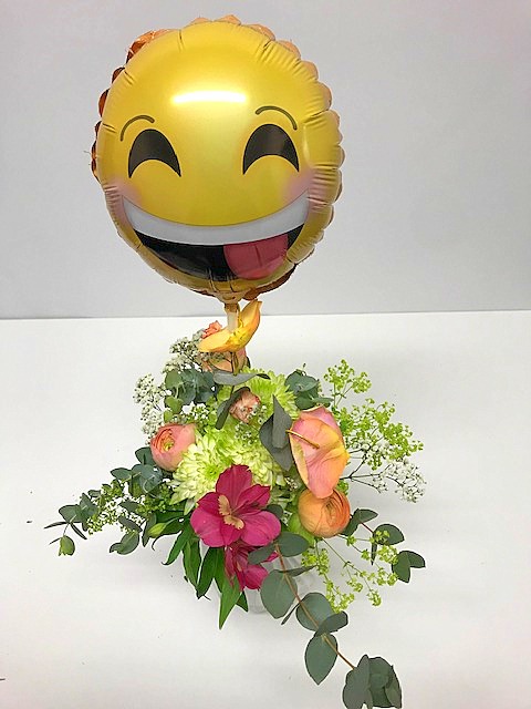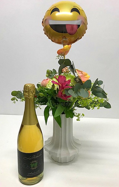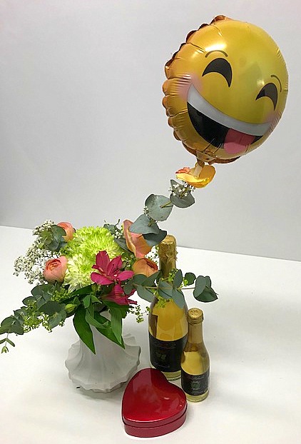 Kuvanmukainen matalaan sidottu kukkakimppu krysanteemista, leinikistä, sekä muista kauden kukkasista. Mukaan voit valita KontioMehun lehtikuohujuoman 20 tai 75 cl, sekä suklaasydän rasian.