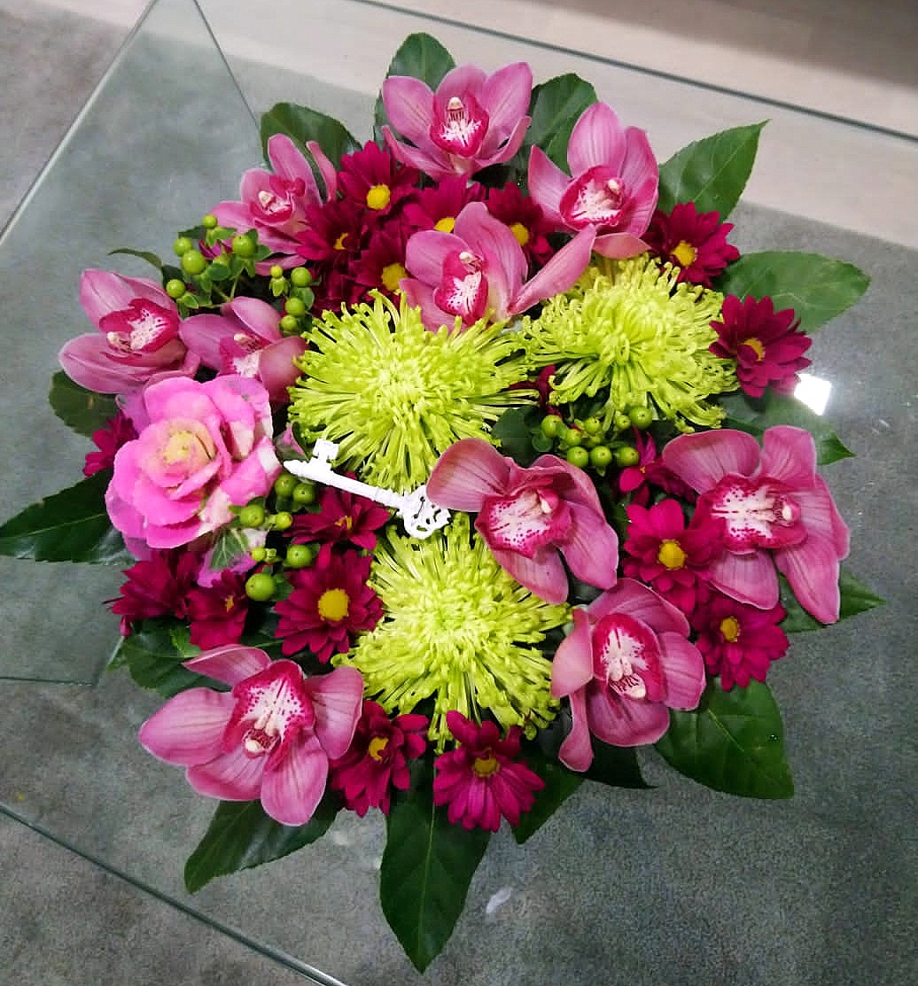 Kuvanmukainen näyttävä kukka-asetelma, jossa muun muassa orkideaa ja krysanteemia ja koristevihreitä. Astia kuuluu tuotteen hintaan.