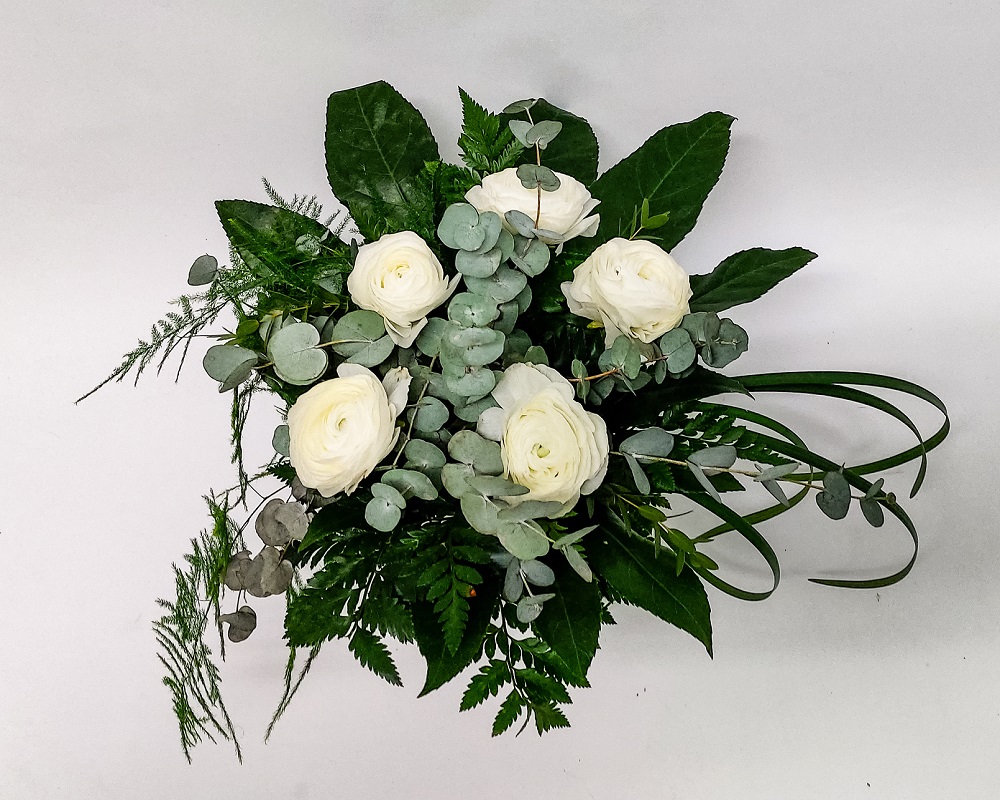 Matalaan sidottu surukimppu leinikistä ja koristevihreistä.