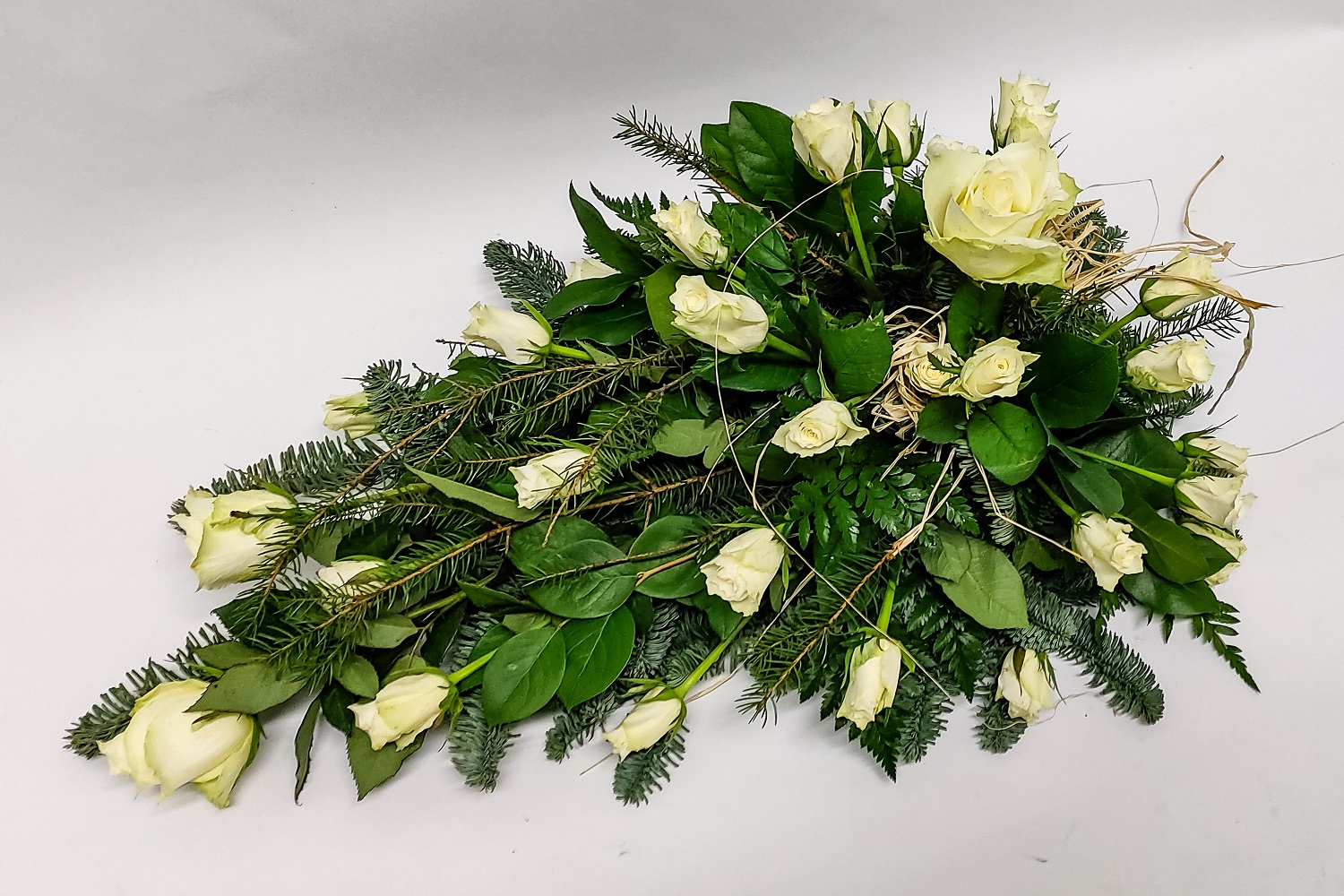 Valkoinen surulaite valkoisista ruusuista ja havuista.