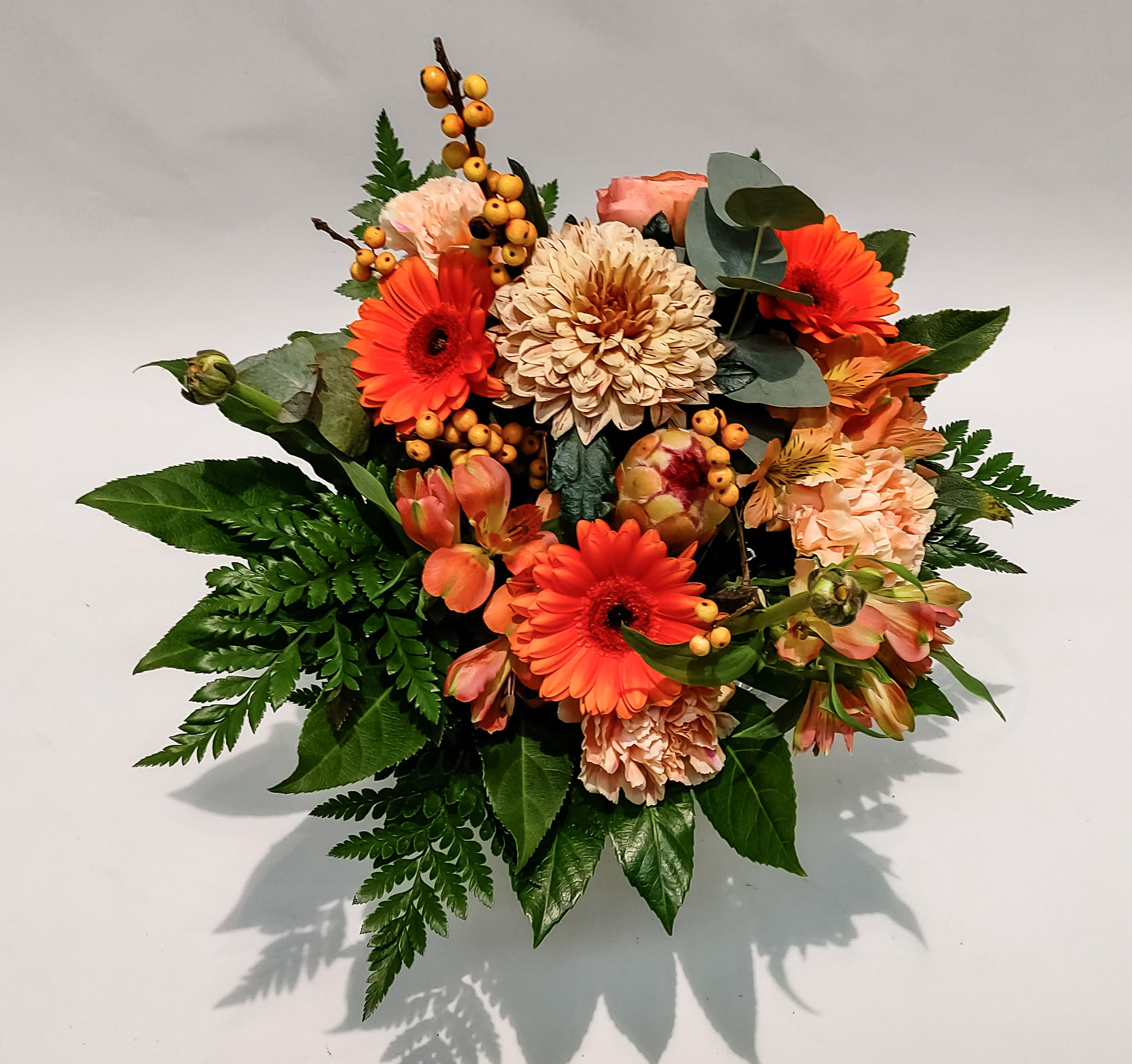 Matalaan sidottu kukkakimppu gerberasta. krysanteemista, neilikasta, inkaliljasta, sekä koristevihreistä.