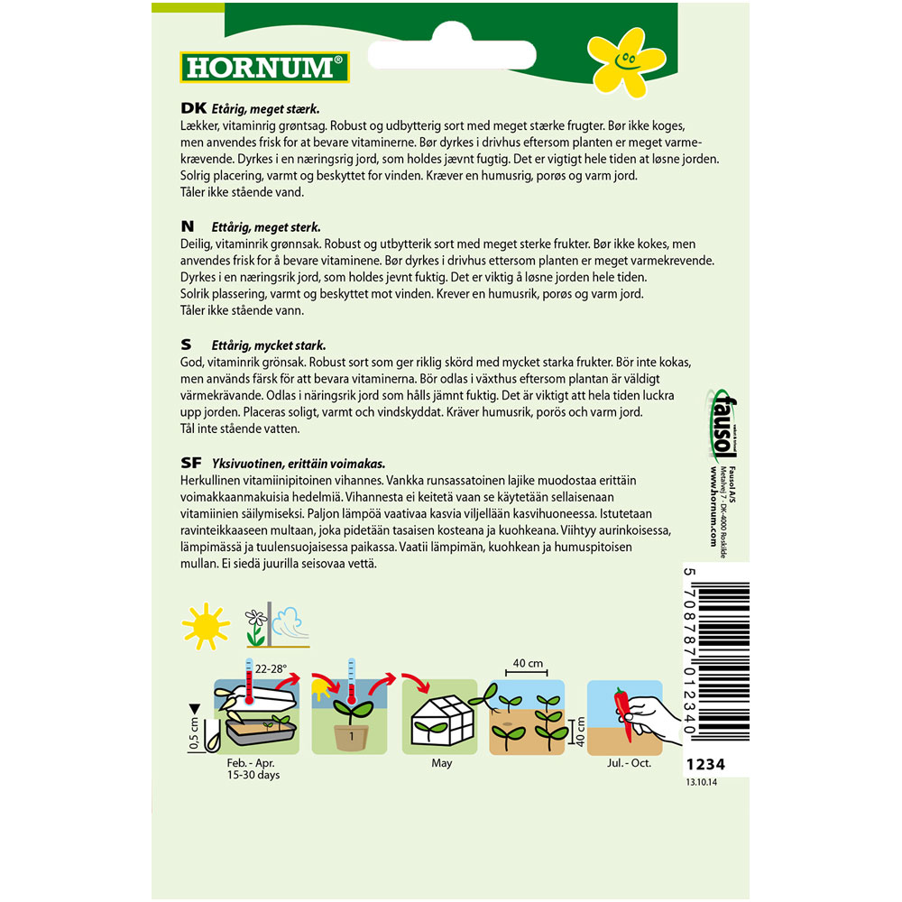 Pitkät, punaiset, vitamiinipitoiset hedelmät kehittävät terävän, pikantin maun raakana. Rakastavat aurinkoista ja suojaisaa paikkaa. Tarvitset humuspitoista, hyvin valutettua, ravintoaineista multaa. Kylvöaika – esiviljely: helmikuu, maaliskuu, huhtikuu Sadonkorjuuaika: heinäkuu, elokuu, syyskuu, lokakuu Sijainti: aurinkoinen sijainti Sisältö riittää noin 50 kasville Kasvien väli rivillä: 40 cm Riviväli: 40 cm Kylvösyvyys: 0,5 – 1 cm Kasvien suurin korkeus: 50-60 cm Kukkien väri: valkoinen