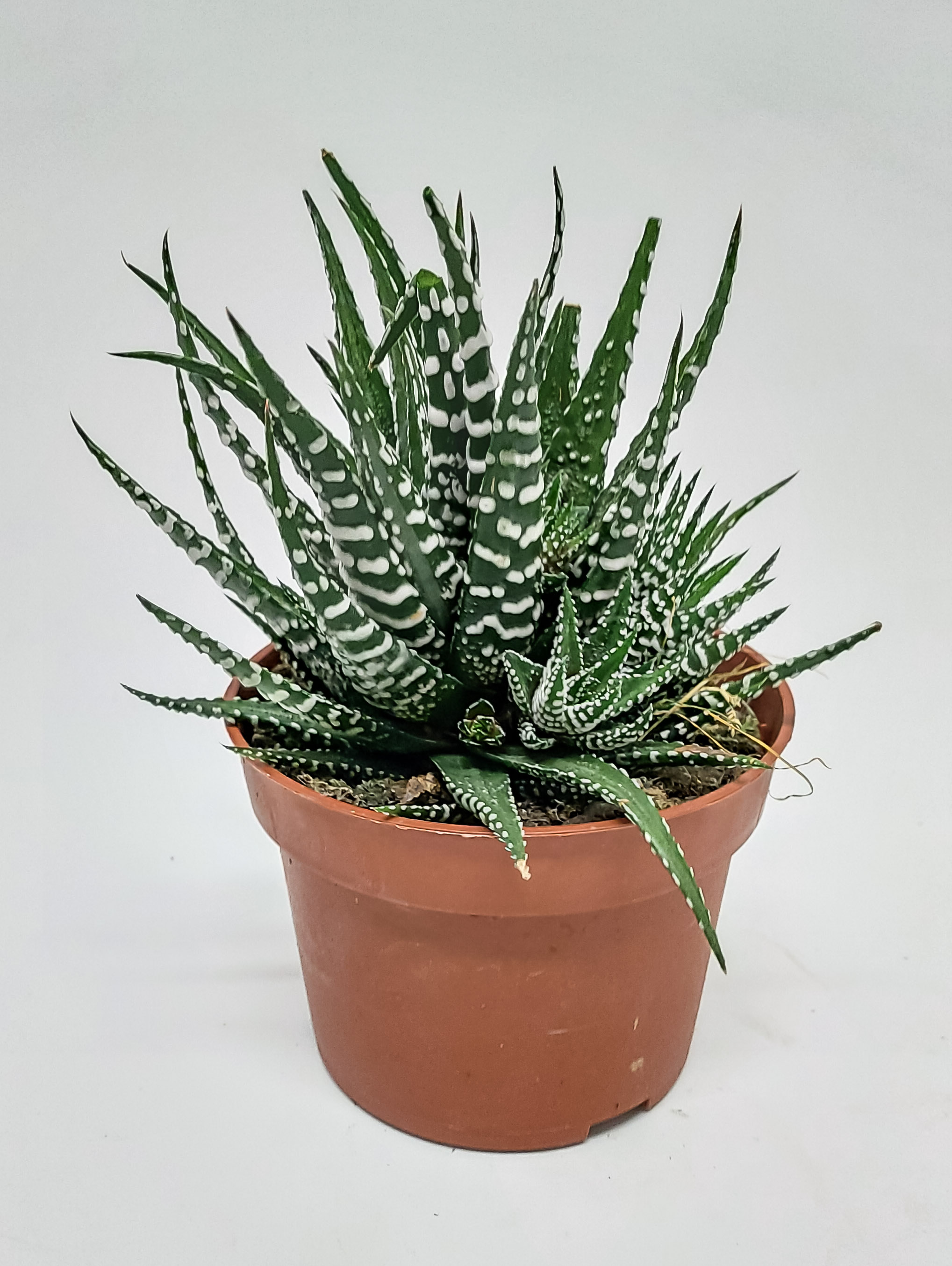Kirjotähti (Haworthia fasciata) vaatii paljon valoa. Se viihtyy parhaiten itä-, etelä- tai länsi-ikkunalla. Keväällä ja kesällä se pitää kuitenkin suojata kaikkein voimakkaimmalta auringolta. Kasvi on herkkä mätänemään, joten kastele sitä harkiten etenkin talvella. Voit lannoittaa kesällä parin viikon välein kaktuksille tarkoitetulla lannoitteella. Korkeus noin 20 cm. Ruukun koko 10 cm.