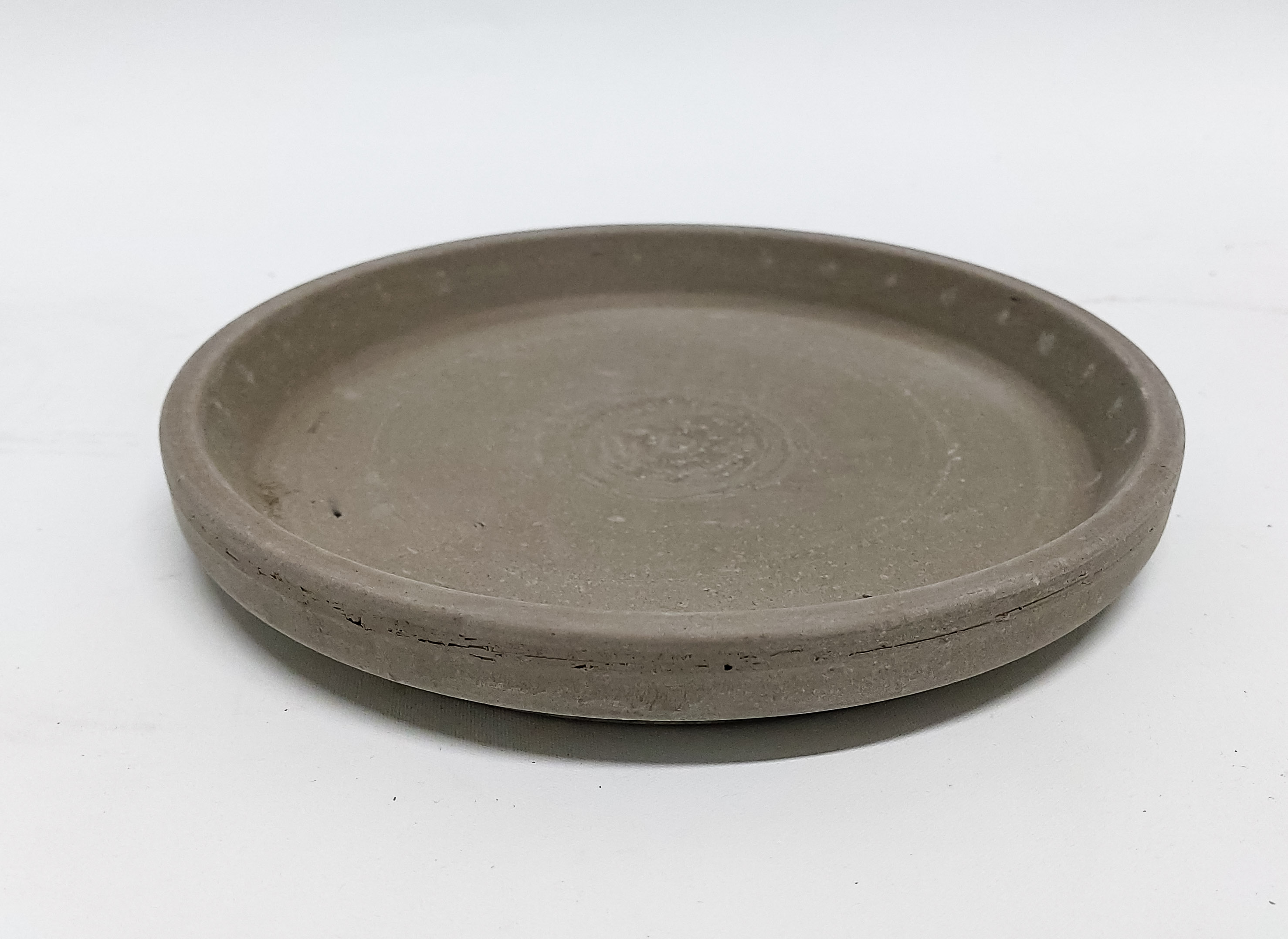 Harmaa savinen aluslautanen sileällä pinnalla. Halkaisija 10.8 cm.