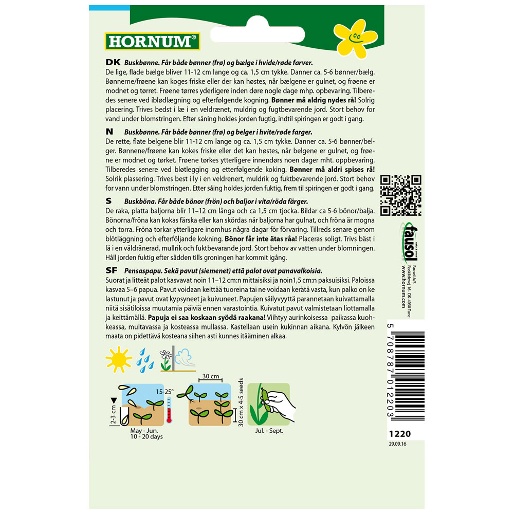 Pensaspapu. Sekä pavut (siemenet) että palot ovat punavalkoisia. Suorat ja litteät palot kasvavat noin 11–12 cm:n mittaisiksi ja noin1,5 cm:n paksuisiksi. Paloissa kasvaa 5–6 papua. Pavut voidaan keittää tuoreina tai ne voidaan kerätä vasta, kun palko on ke lastunut ja pavut ovat kypsyneet ja kuivuneet. Papujen säilyvyyttä parannetaan kuivattamalla niitä sisätiloissa muutamia päiviä ennen varastointia. Kuivatut pavut valmistetaan liottamalla ja keittämällä. Papuja ei saa koskaan syödä raakana! Viihtyy aurinkoisessa paikassa kuohkeassa, multavassa ja kosteassa mullassa. Kastellaan usein kukinnan aikana. Kylvön jälkeen maata on pidettävä kosteana siihen asti kunnes itääminen alkaa.