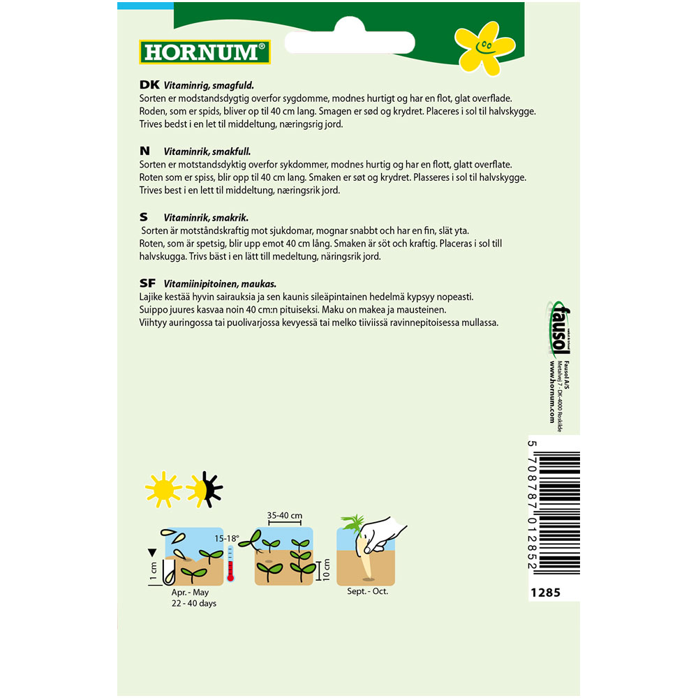 Vitamiinipitoinen, maukas. Lajike kestää hyvin sairauksia ja sen kaunis sileäpintainen hedelmä kypsyy nopeasti. Suippo juures kasvaa noin 40 cm:n pituiseksi. Maku on makea ja mausteinen. Viihtyy auringossa tai puolivarjossa kevyessä tai melko tiiviissä ravinnepitoisessa mullassa. Kylvön jälkeen maata on pidettävä kosteana siihen asti kunnes itääminen alkaa.
