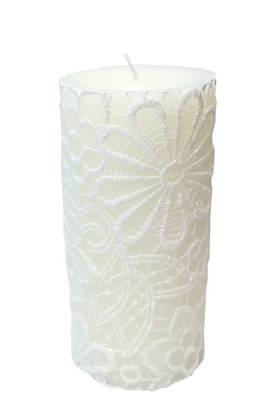 Pitsinen, valkoinen tai harmaa kynttilä sopii kauniisti niin juhlakattaukseen kuin arkisen illan tunnelmaankin. Mitat 7x14cm Pitsi kuvioitu pinta. Väri valkoinen tai harmaa.
