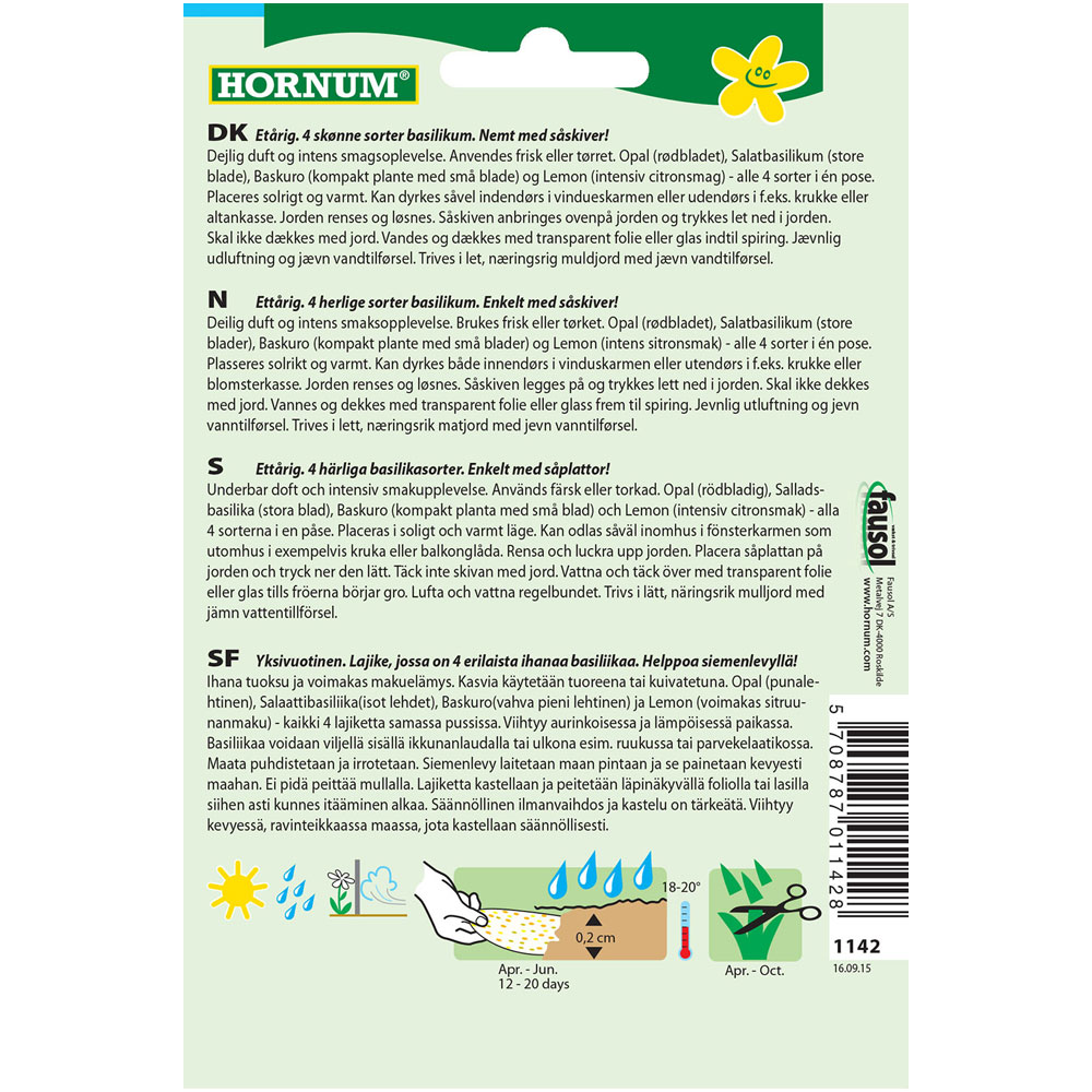 Yksivuotinen. Lajike, jossa on 4 erilaista ihanaa basiliikaa. Helppoa siemenlevyllä! Ihana tuoksu ja voimakas makuelämys. Kasvia käytetään tuoreena tai kuivatetuna. Opal (punalehtinen), Salaattibasiliika(isot lehdet), Baskuro(vahva pieni lehtinen) ja Lemon (voimakas sitruunanmaku) - kaikki 4 lajiketta samassa pussissa. Viihtyy aurinkoisessa ja lämpöisessä paikassa. Basiliikaa voidaan viljellä sisällä ikkunanlaudalla tai ulkona esim. ruukussa tai parvekelaatikossa. Maata puhdistetaan ja irrotetaan. Siemenlevy laitetaan maan pintaan ja se painetaan kevyesti maahan. Ei pidä peittää mullalla. Lajiketta kastellaan ja peitetään läpinäkyvällä foliolla tai lasilla siihen asti kunnes itääminen alkaa. Säännöllinen ilmanvaihdos ja kastelu on tärkeätä. Viihtyy kevyessä, ravinteikkaassa maassa, jota kastellaan säännöllisesti.